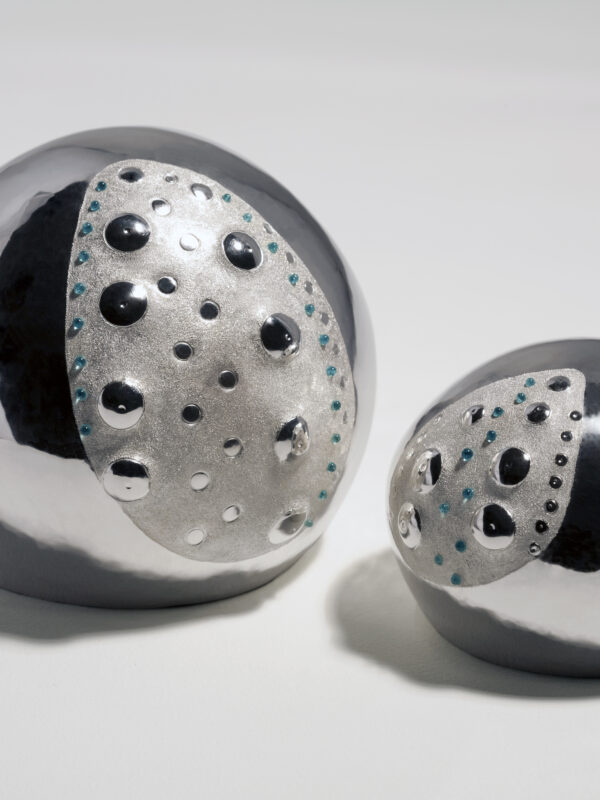 Gilding metal sheet hammered, drilled, embossed, gold leaf, pikes and beads of Murano glass, black patina.Height 100mm Diameter 120mm.Unique piece,...